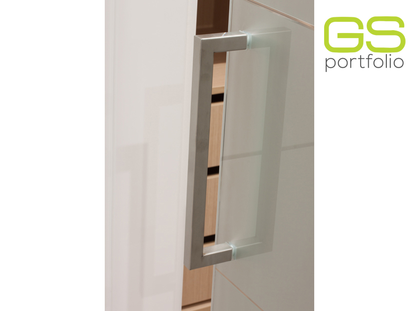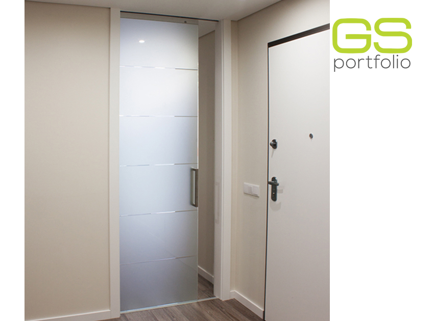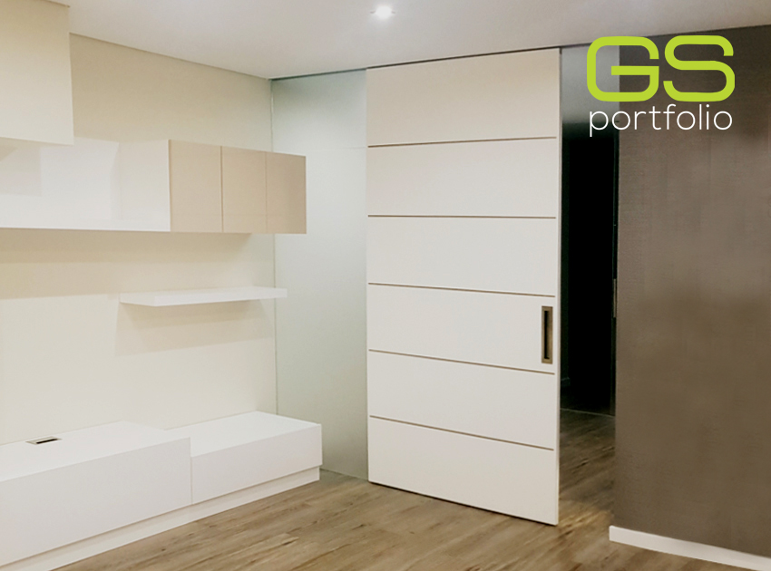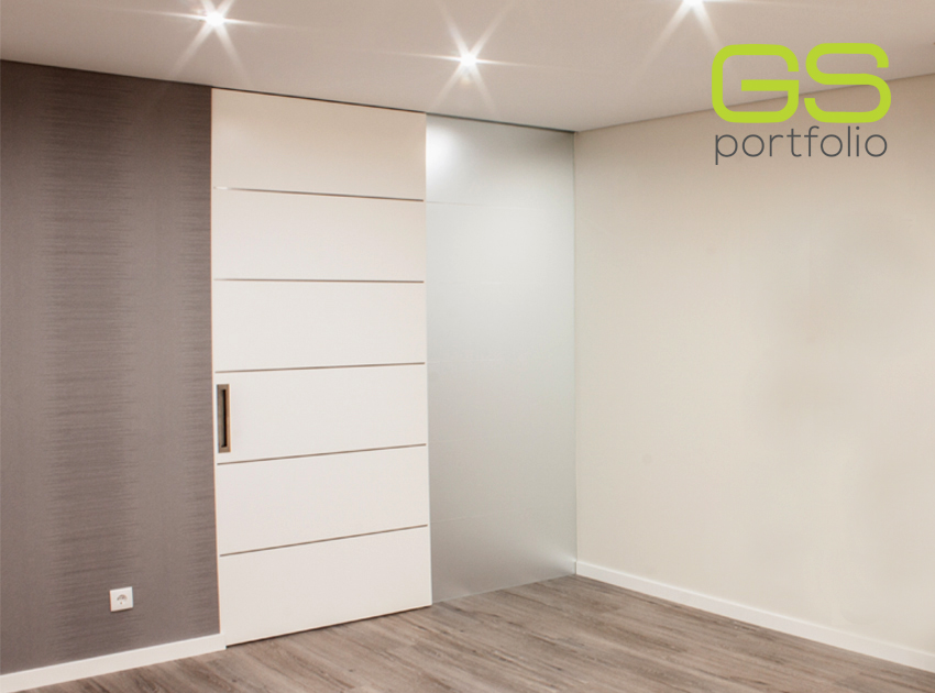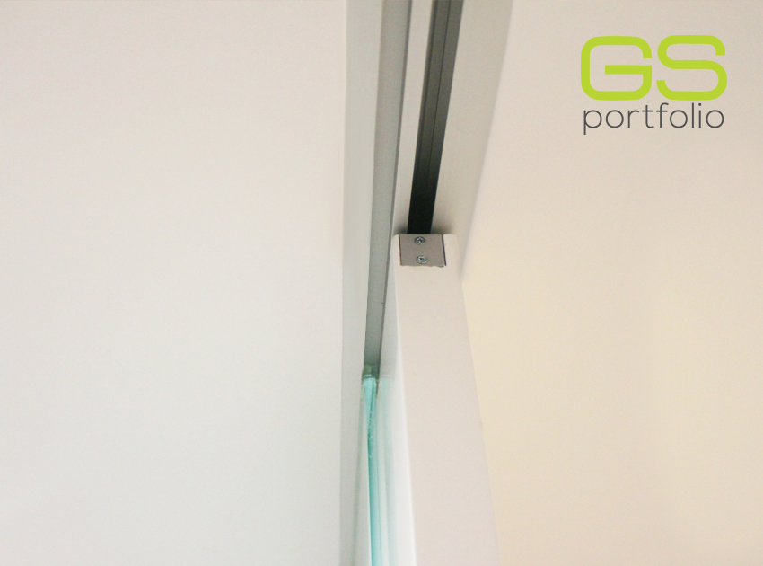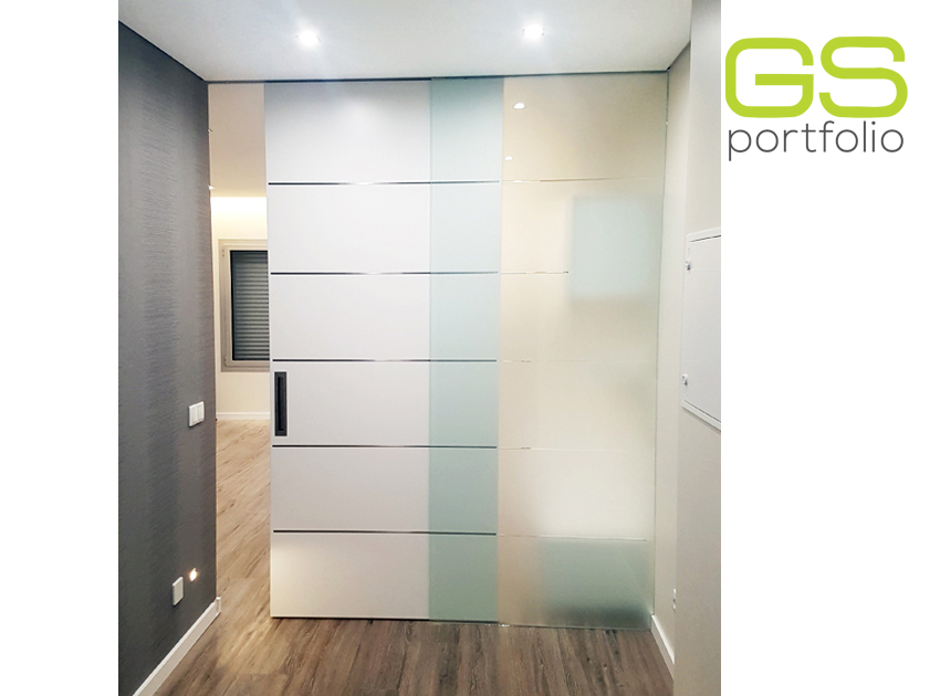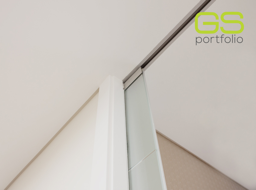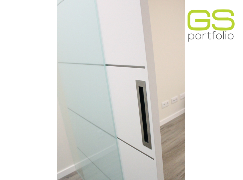 - OPENSPACE Sliding door system – INSIDE – with lacquered door in matte white. Combined with fixed white frosted glass panel.