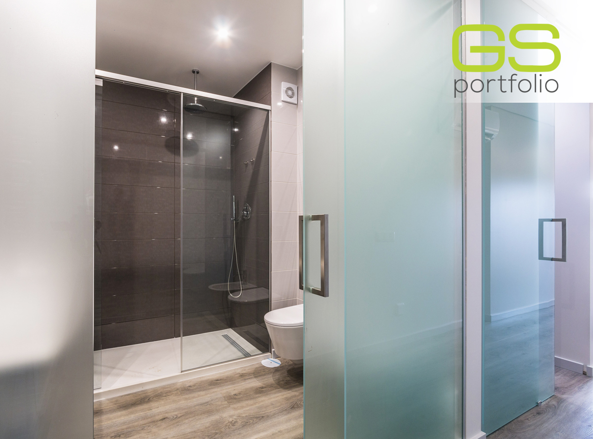 - INSIDE DV sliding door system by OPENSPACE with fixed frosted glass panel, combined with frosted glass sliding door!