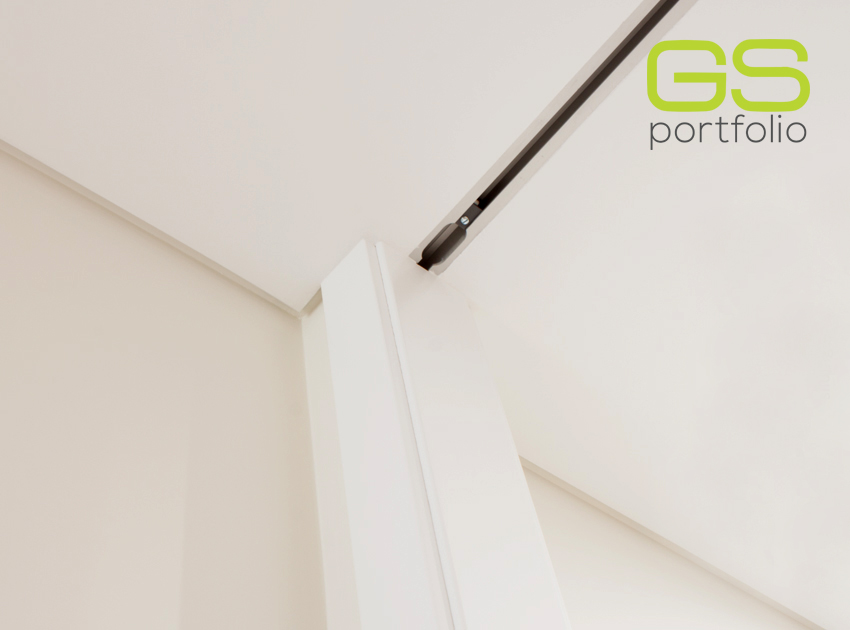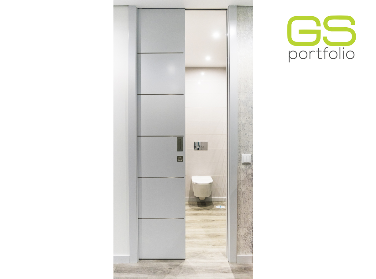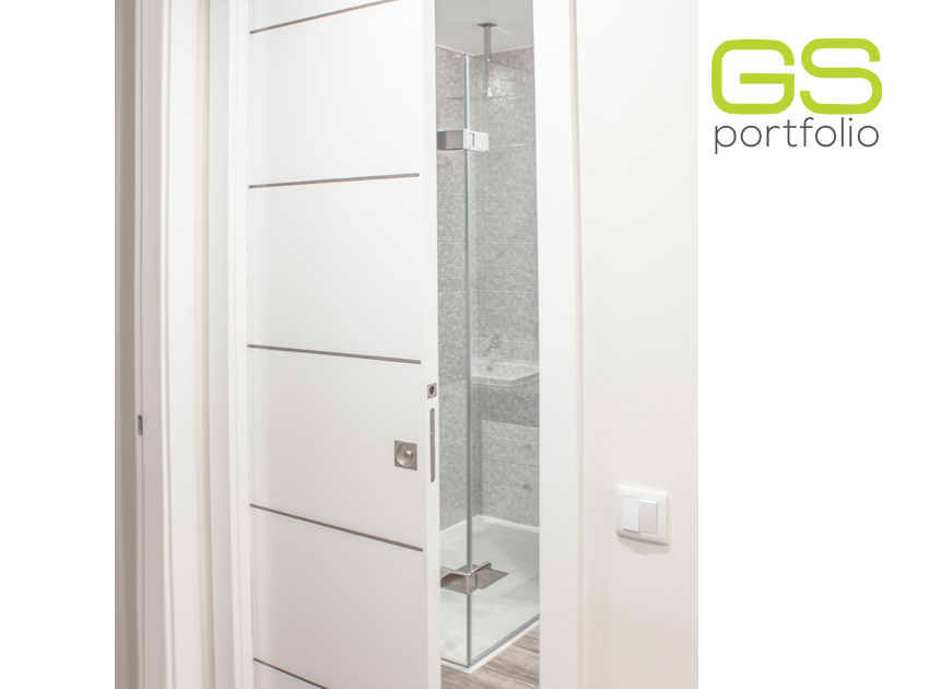 Frame for sliding door (UNICO PLUS model) with white lacquered wooden door with 5 bevelled stripes. Door frame and architrave with matt white lacquer finish.