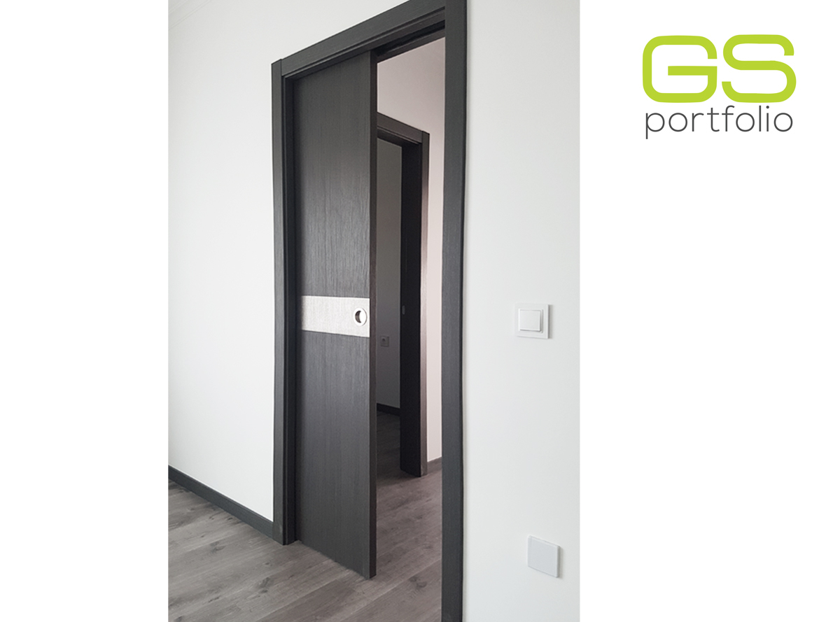 Frame for sliding door (UNICO model) - wooden door with VINYL TOUCH covering (PLOMO OAK), with decorative strip in LUNA ACCIAIO - Scudo. Door frame and architrave also in wood with VINYL TOUCH covering (PLOMO OAK).