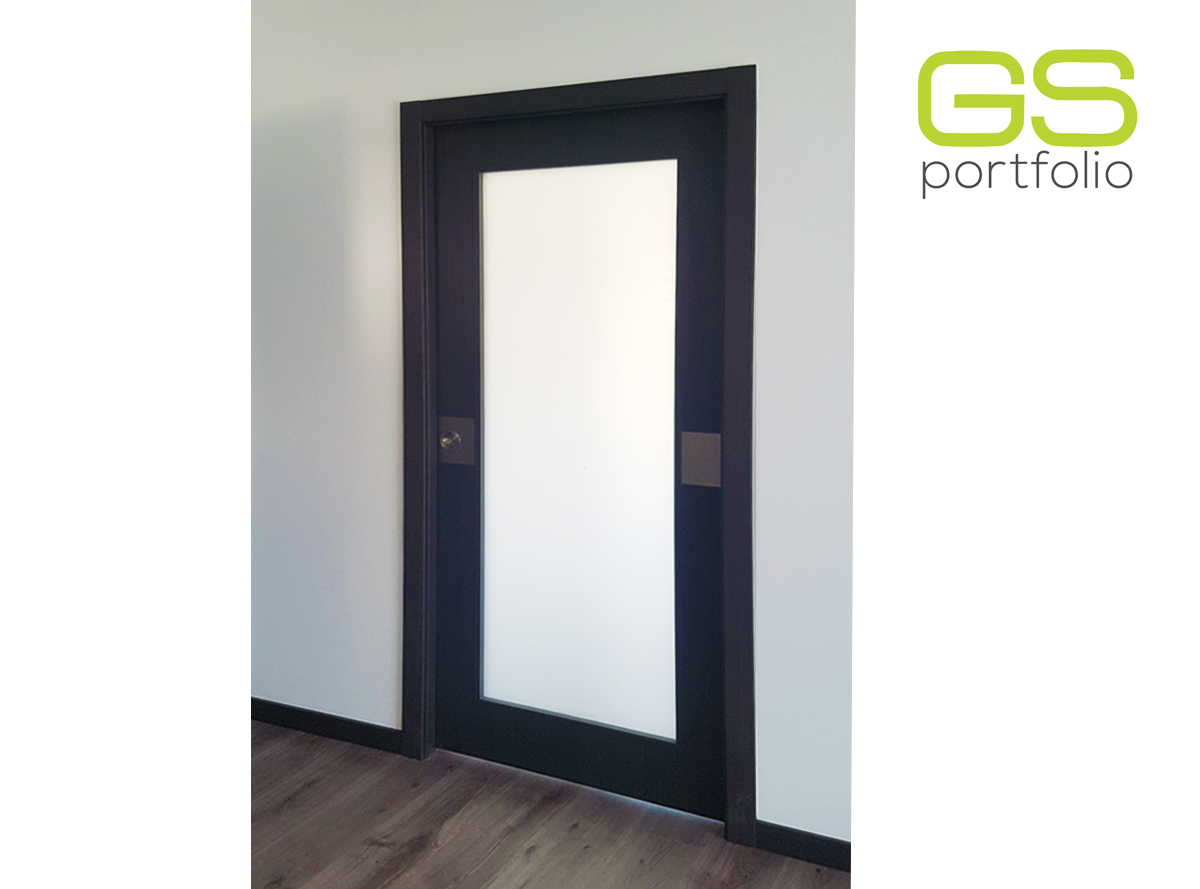 Frame for sliding door (UNICO model) - wooden door with VINYL TOUCH covering (PLOMO OAK), with frosted glass opening and decorative strip in LUNA ACCIAIO - Scudo.