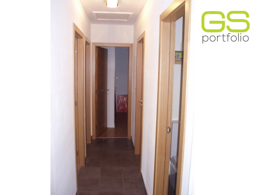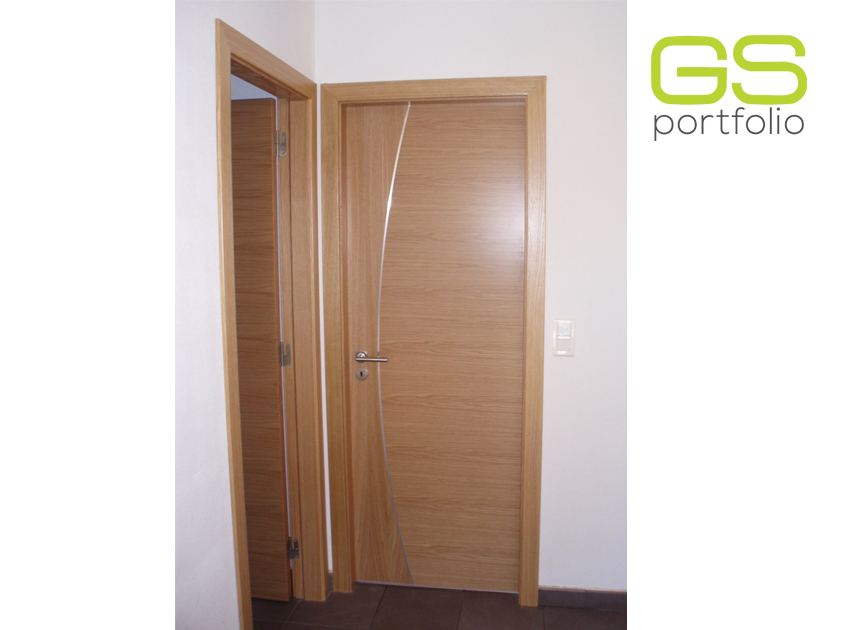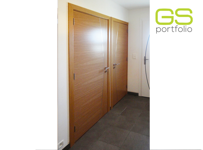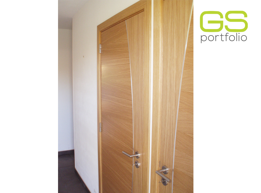 Portas batentes GS DOORS, da gama STYLE, com a referência: 1H1V-1FCA. Revestimento a folha de madeira: Carvalho Natural, com friso decorativo de alumínio e guarnições.