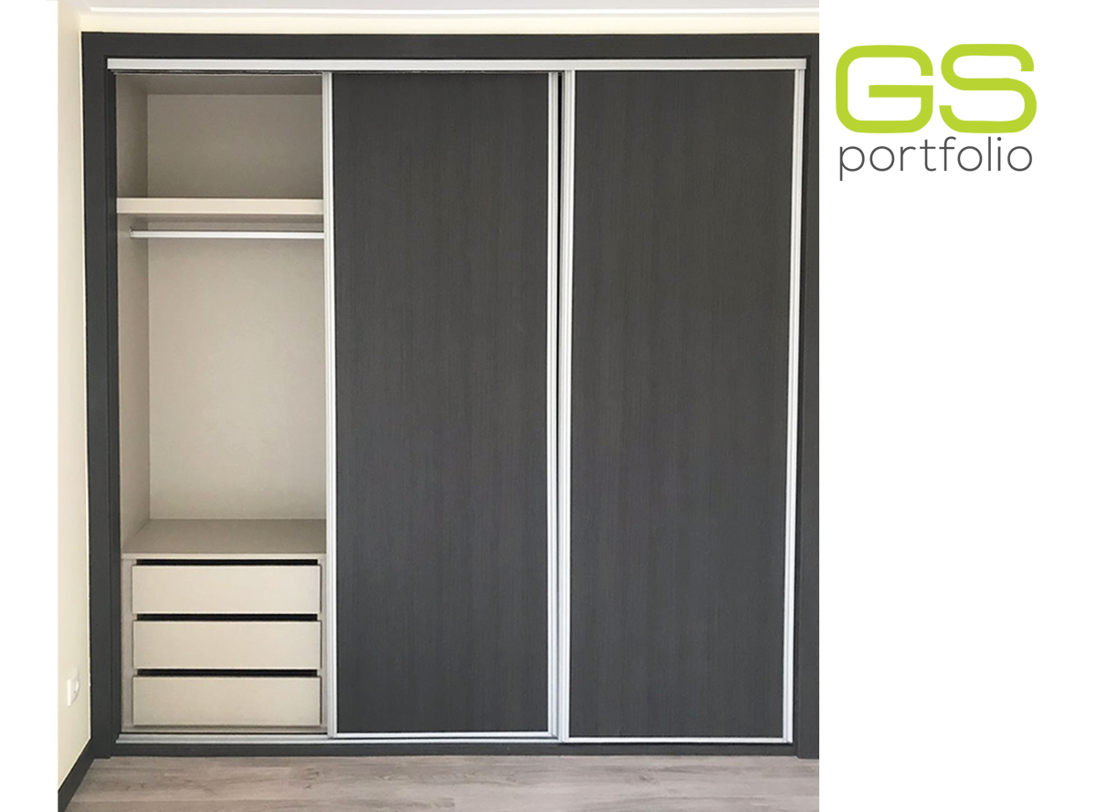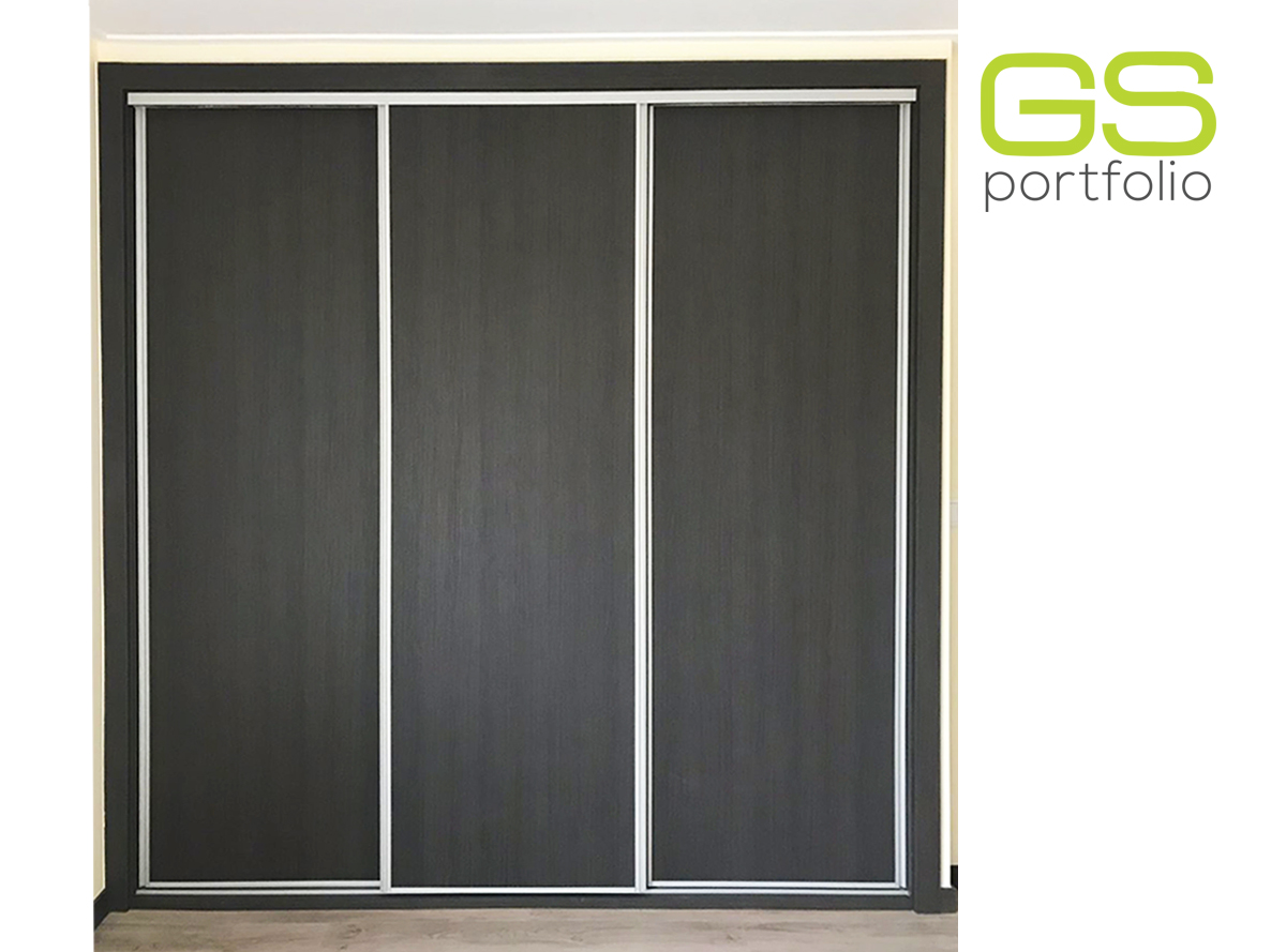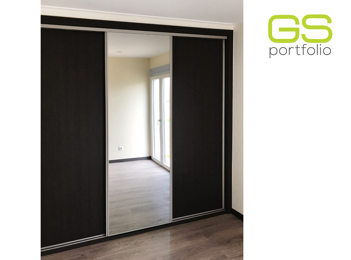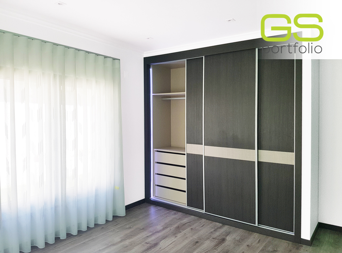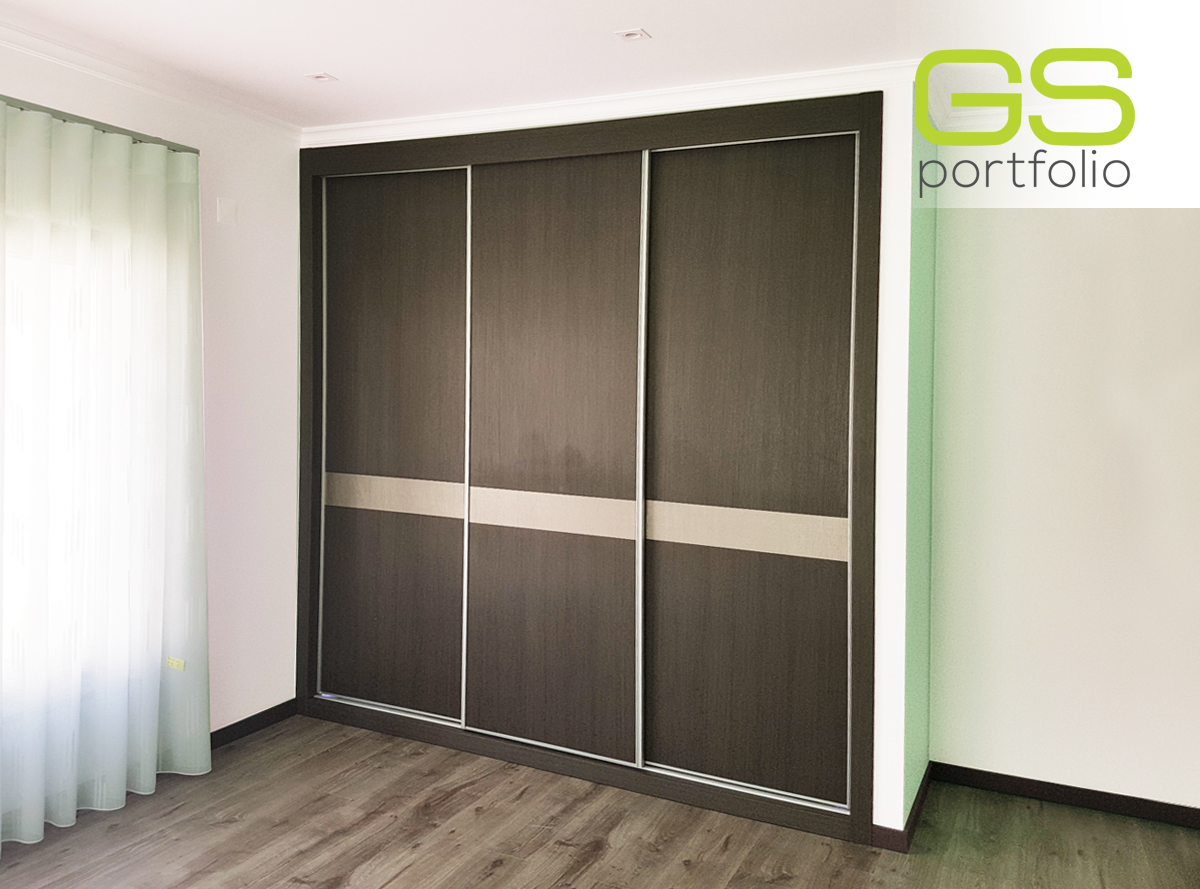 - Roupeiro embutido GS CONCEPT com 3 portas de correr em vinyl: Carvalho Brown e perfil lateral puxador em alumínio.